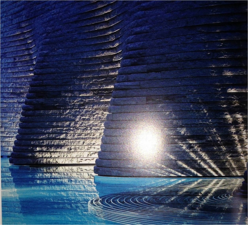 「新業(yè)觀峰」正對筏子溪河濱景觀,基地大幅退縮形成街廓步道,石村敏哉景觀設(shè)計(jì)師以卵石、天然石洗石子、花崗石三種弧形曲線鋪面,呼應(yīng)水岸住宅筏子溪水流的感覺。庭園鋪面是臺中大地的顏色,使用花崗石、花崗石亂張,搭配透水陶粒洗石子、陶磚、紅斑巖凸面等較自然的材料來做鋪面,?讓人們回到最原始自然的大地上自然詩意的棲居。