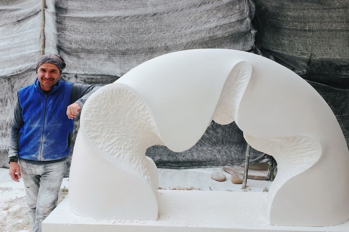 將粗曠的石面,研磨成一座自然圓弧的立體雕塑,