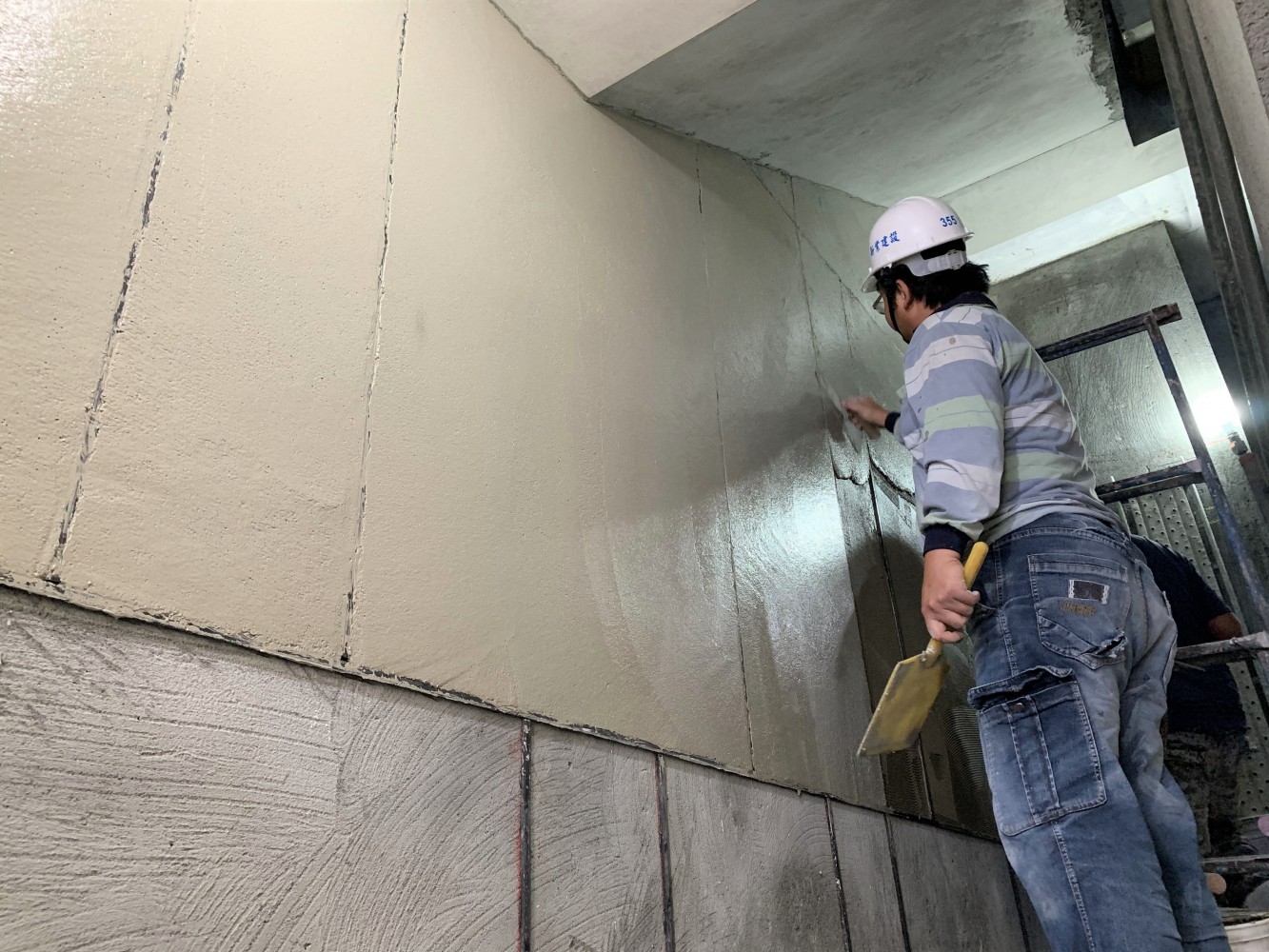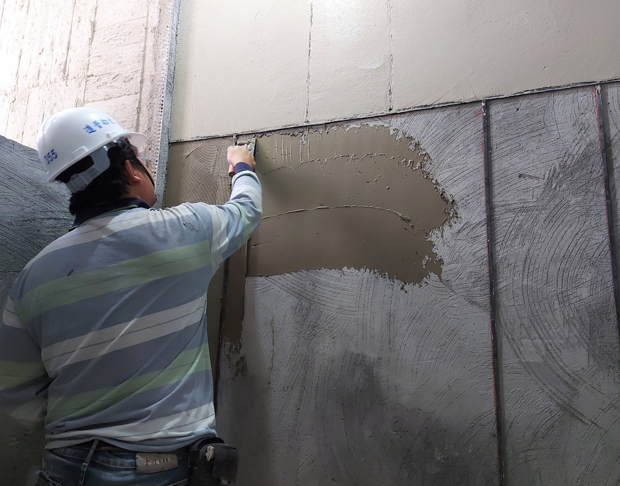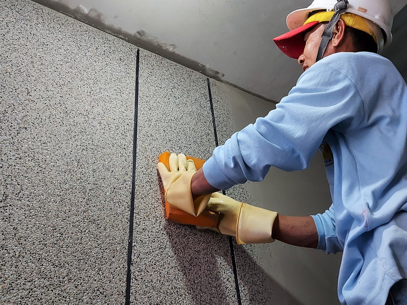 職人手中的推刀, 將混合的抿石子一遍遍在牆面抹開, 待半乾後,用那溫暖厚實的雙手, 輕撫著海綿,反覆擦拭, 直到呈現光滑圓潤的觸感。