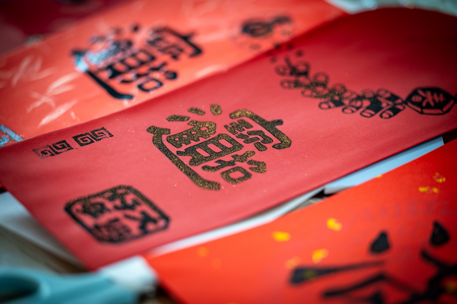一幅幅版印春聯(lián)與紅包袋,道盡吉祥話。
