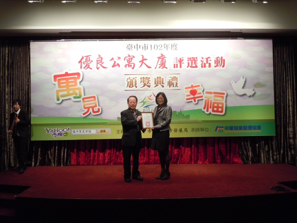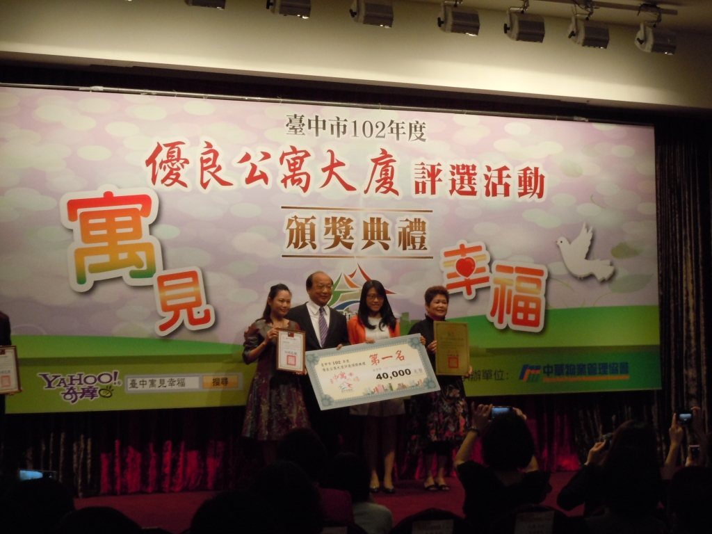 【大塊美術(shù)】榮獲臺(tái)中市102年度優(yōu)良公寓大廈評(píng)選『小型住宅社區(qū)組第一名』、『組織經(jīng)營(yíng)特色獎(jiǎng)』等二項(xiàng)大獎(jiǎng)