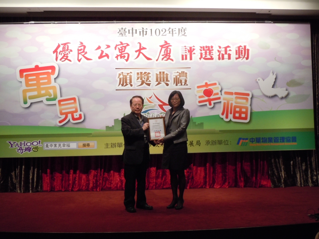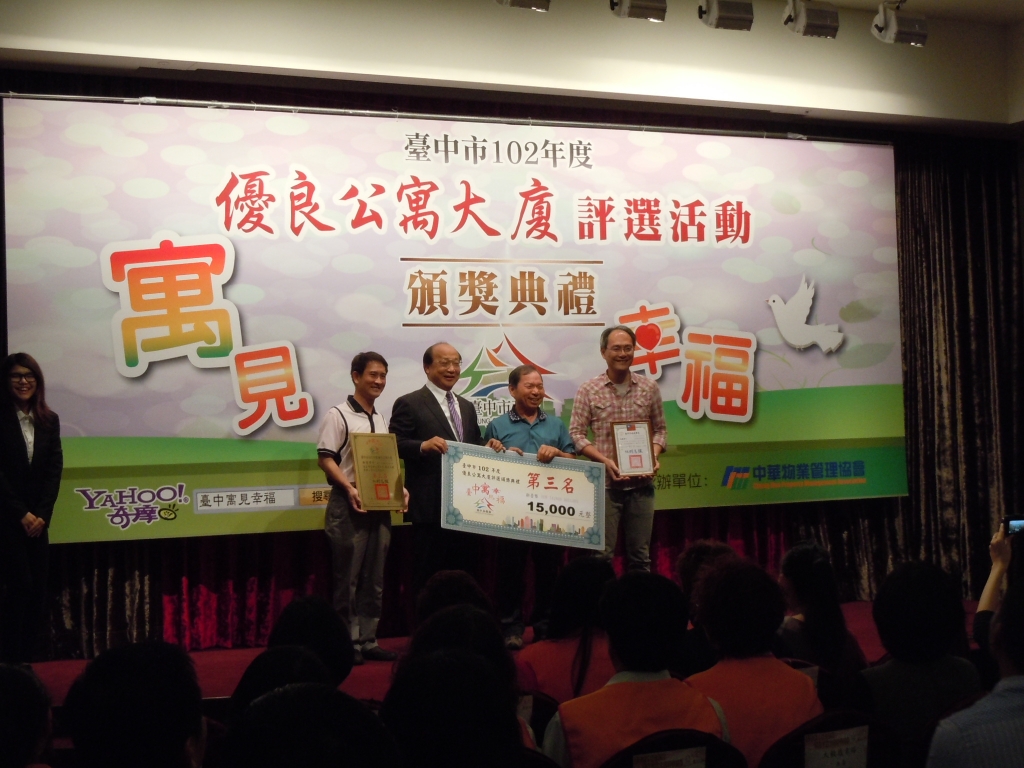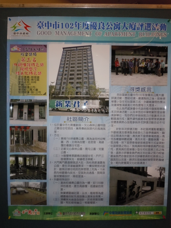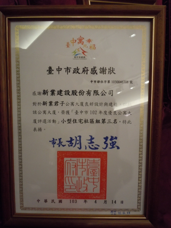 【新業(yè)君子】榮獲臺中市102年度優(yōu)良公寓大廈評選『小型住宅社區(qū)組第三名』、『環(huán)境整潔綠美化特色獎(jiǎng)』、『外觀維護(hù)特色獎(jiǎng)』等三項(xiàng)大獎(jiǎng)
